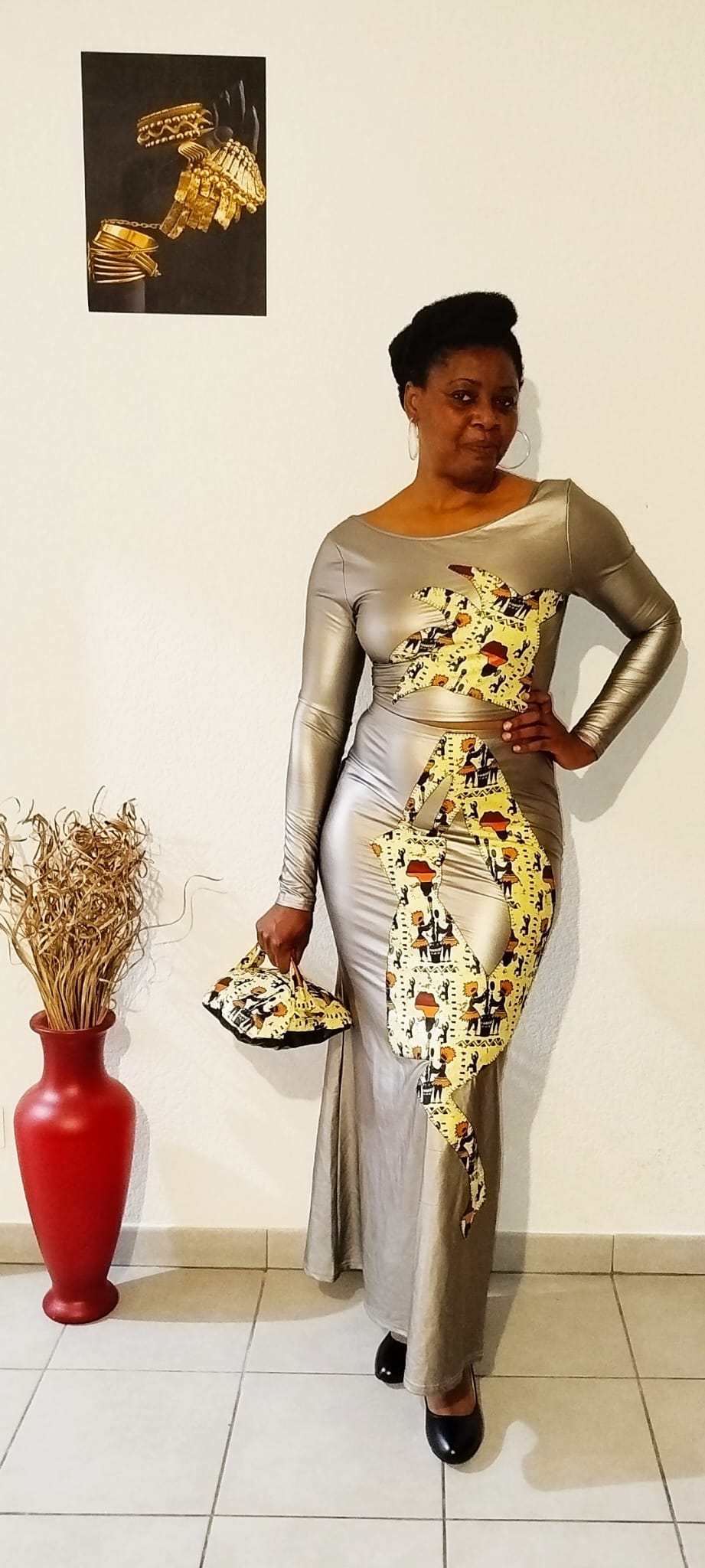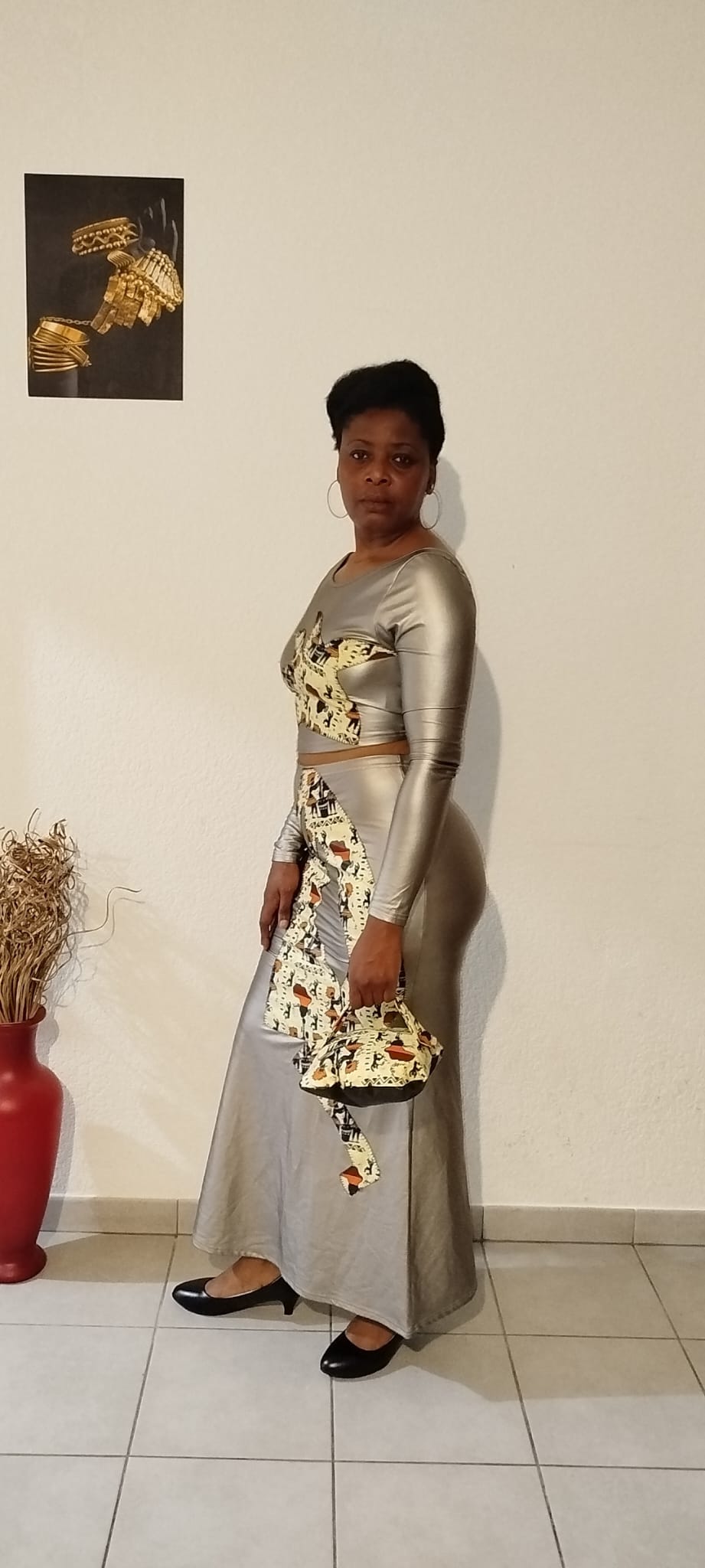 Ensemble jupe et haut en simili cuir plus son sac à main customisés.